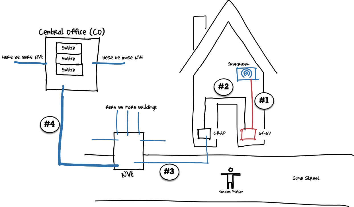 Let’s trace the fiber back from the subscriber to the first active network device: the subscriber is in their apartment and has a home router providing access to their devices at home, in Germany this is in many cases a Fritzbox. This router is connected to a fiber coming into their apartment (#1).