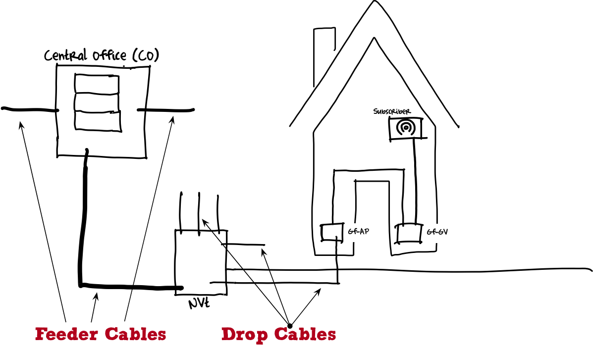 Drop cables are coming from a NVt and going into houses, while feeder cables start at the NVt and going towards the CO. Feeder cables hold more fibers and are aggregating drop cables from the houses towards the CO.