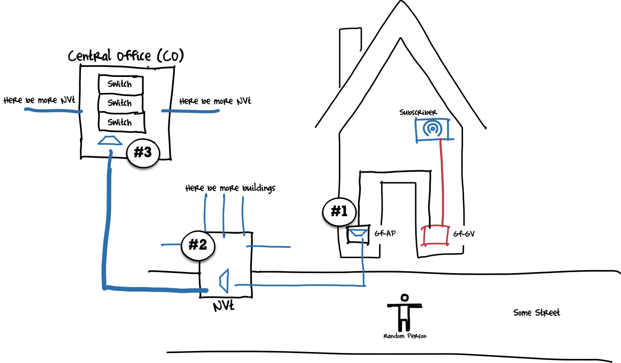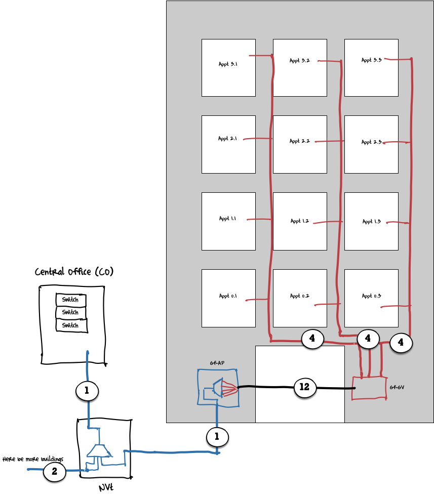 So just for this one example, all 12 apartments share the same fiber towards the NVt, where more subscribers will be put onto one fiber going to the CO, thus reducing the number of fibers we need in each hop.