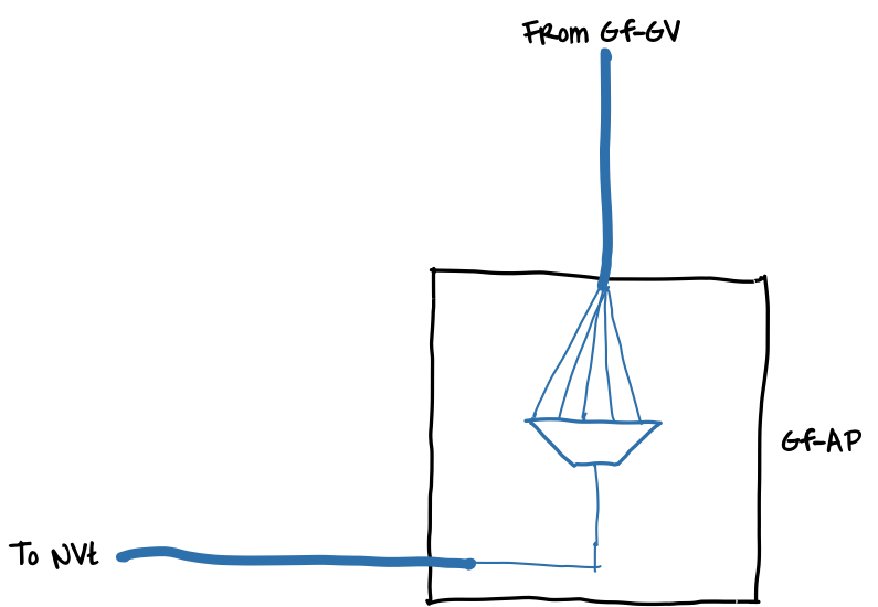 We have a building with 12 apartments, so 12 fibers with active subscribers terminate in the Gf-GV, 4 from each staircase. We are patching them through to the Gf-AP and are using 12 fibers as well on the connection between Gf-GV and Gf-AP. Here we are now installing a 1:16 splitter, so those 12 fibers are connecting all to the splitter and will go out on one fiber towards the NVt. In the NVt we are combining fibers from other buildings on yet another splitter, and again will only use one fiber going to the CO.